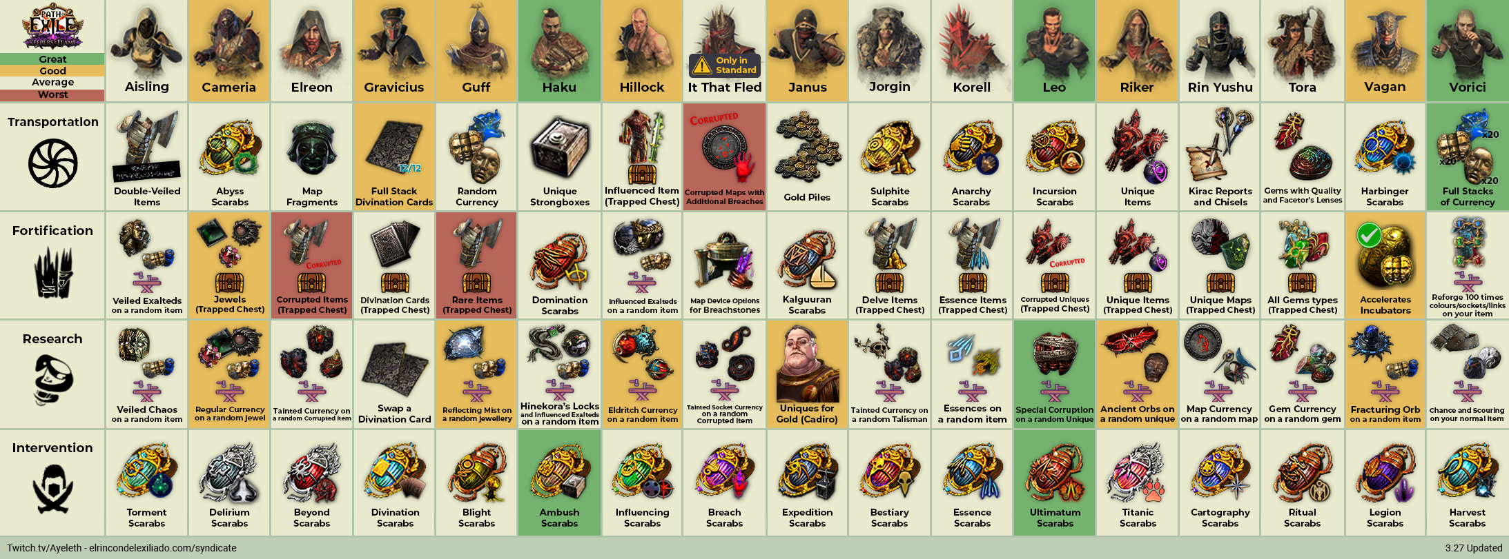 En la Chuleta / Cheatsheet del Sindicato podemos ver que recompensas conseguiremos según la división donde coloquemos a cada miembro de la mecánica. Hay de diferentes tipos, ítems por drop directo, ítems a escoger entre varios con un timer, mesas de crafting con ítems aleatorios, etc.
