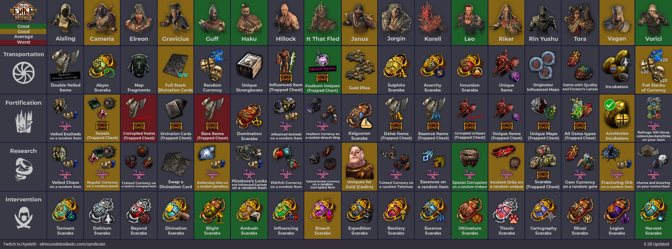 En la Chuleta / Cheatsheet del Sindicato podemos ver que recompensas conseguiremos según la división donde coloquemos a cada miembro de la mecánica. Hay de diferentes tipos, ítems por drop directo, ítems a escoger entre varios con un timer, mesas de crafting con ítems aleatorios, etc.